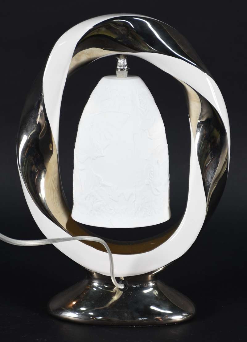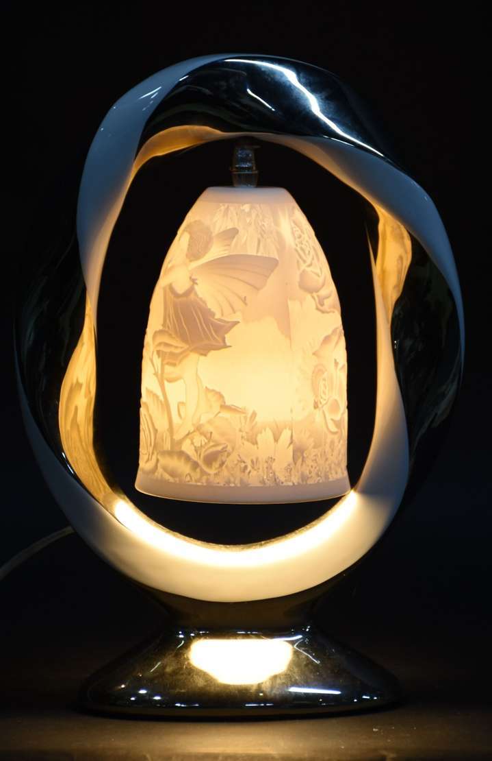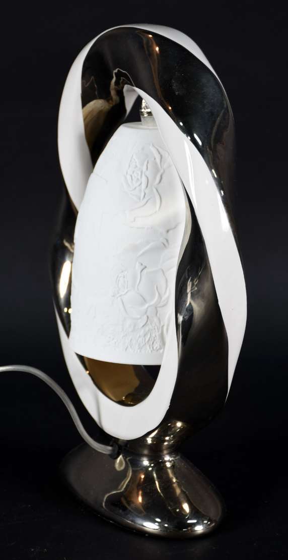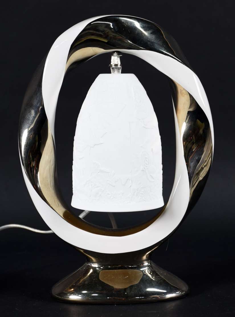 Abatjour de opalina branca com guirlandas e busto de jovem em policromia, globo de vidro lavrado e detalhes de metal...