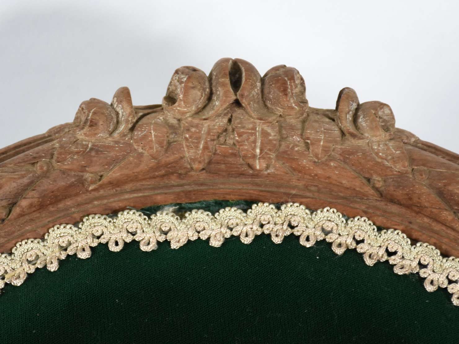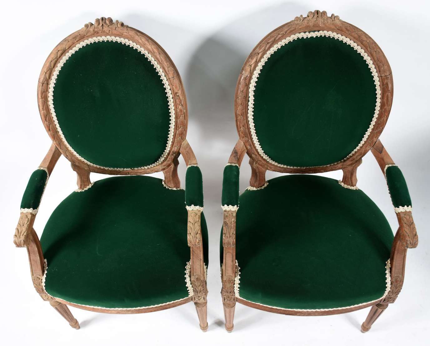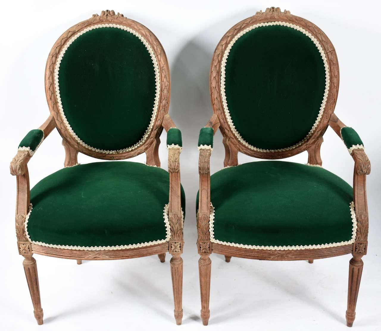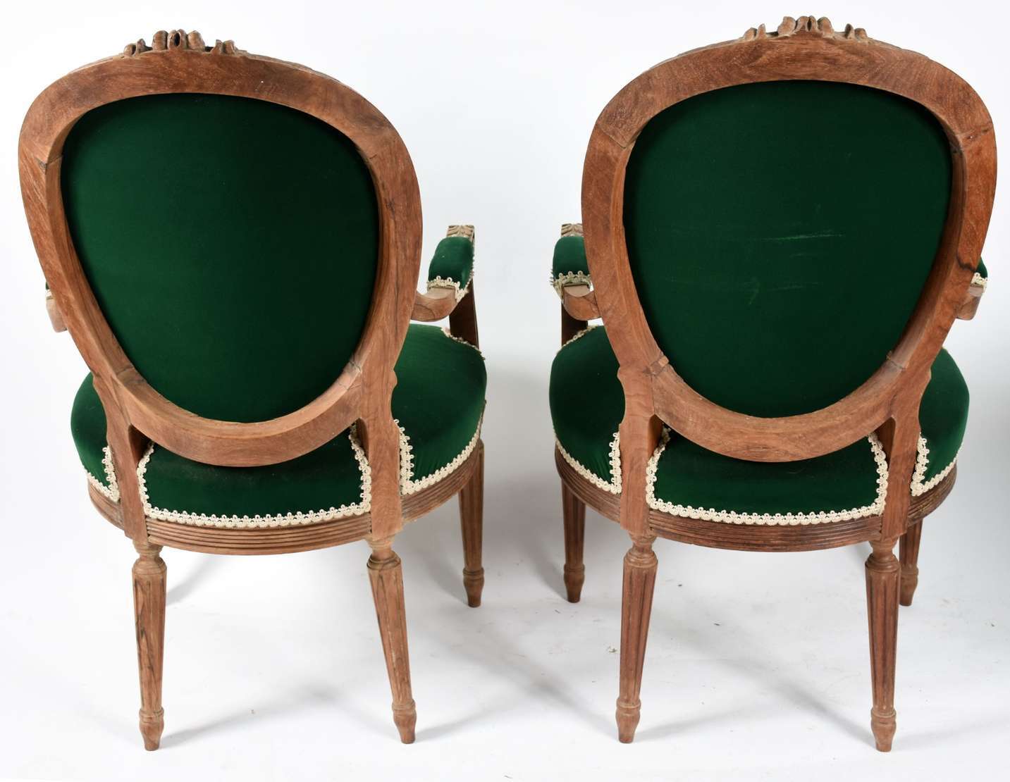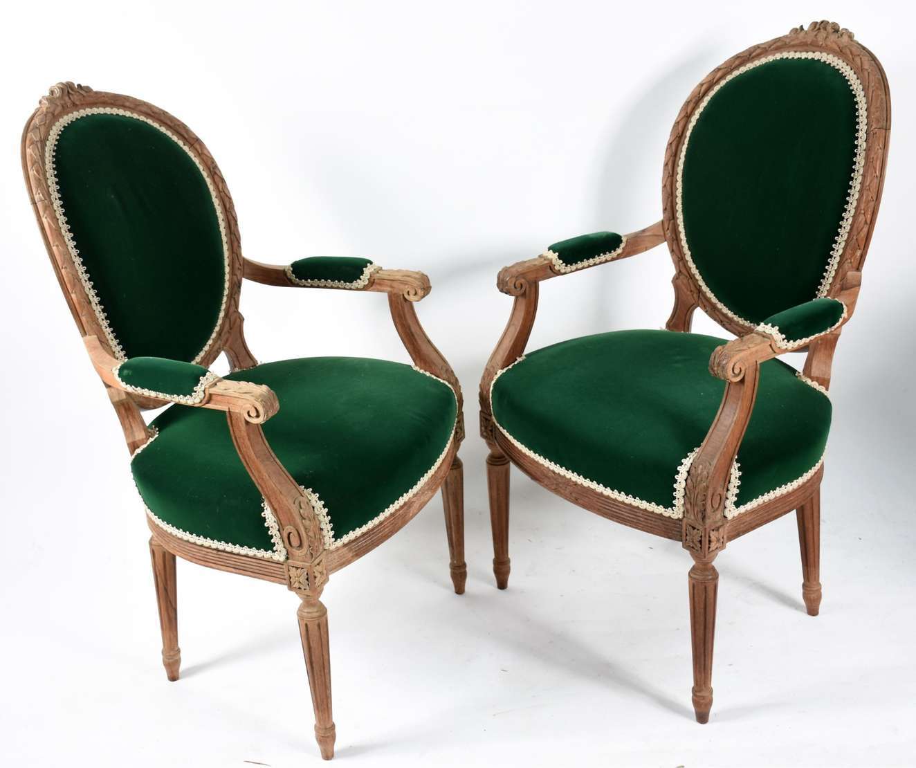 Par de cadeiras de madeira nobre estilo Luiz XVI, estofadas e forradas em veludo verde.