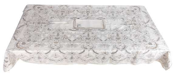 Toalha de mesa da Ilha da Madeira na cor bege com bordados, acompanham 12 guardanapos.