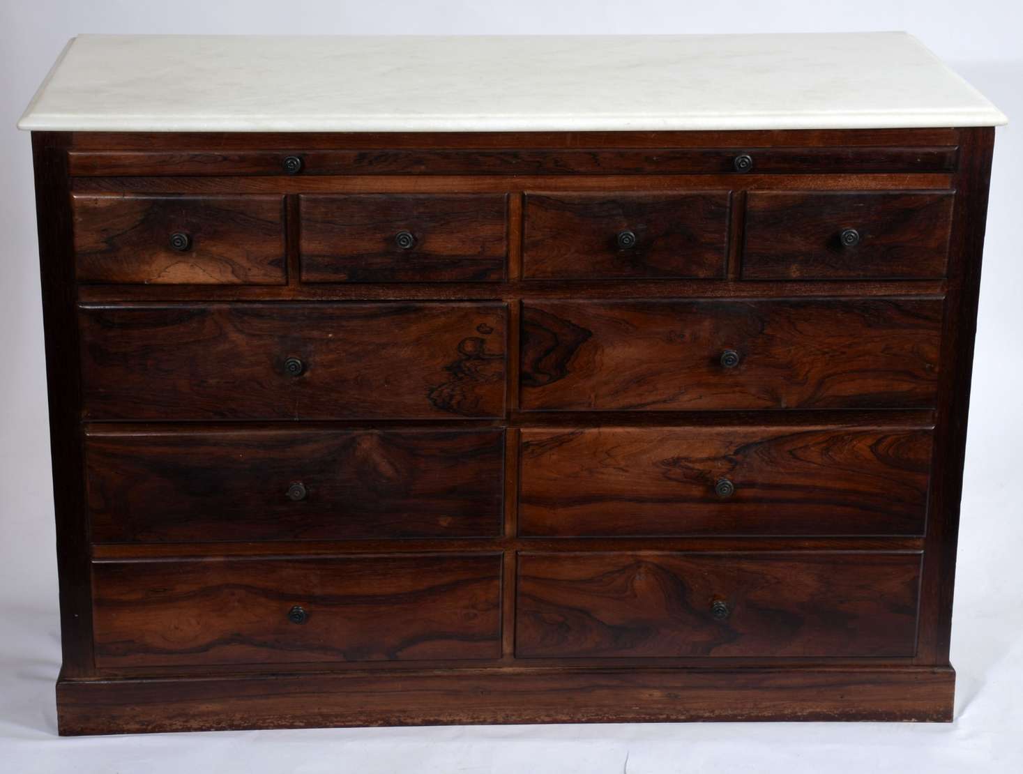 Móvel cômoda/toilette de madeira nobre com dois gavetões e duas gavetas, tampo de mármore encimado por espelho bisota...