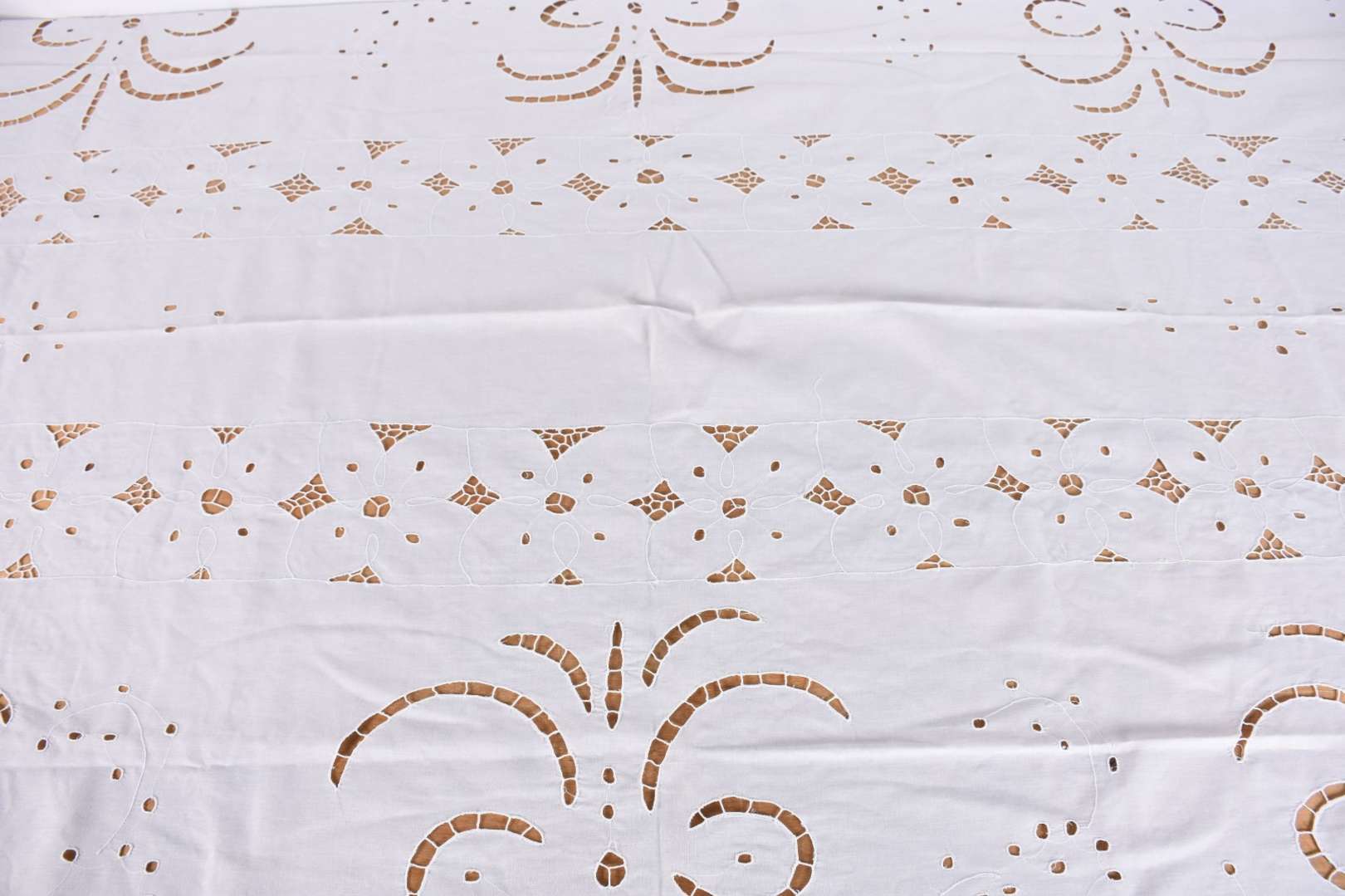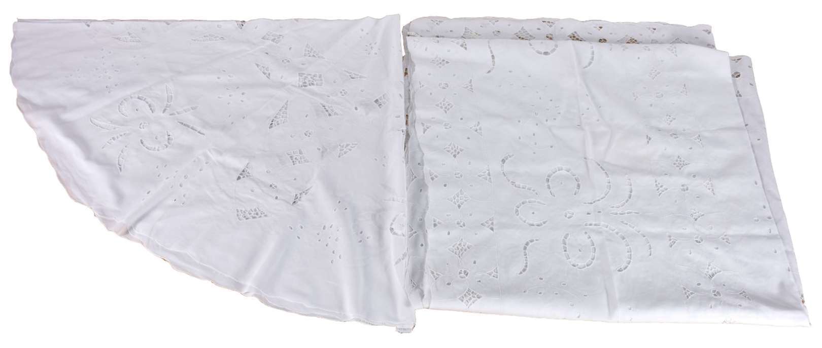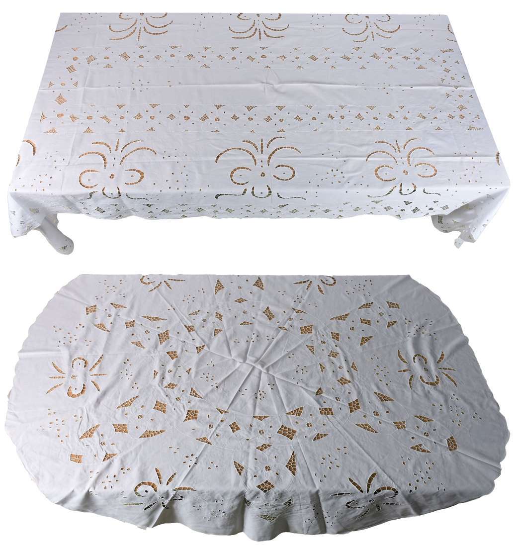 Toalha de mesa de renda branca redonda e dois caminhos de mesa sendo um retangular e outro redondo.