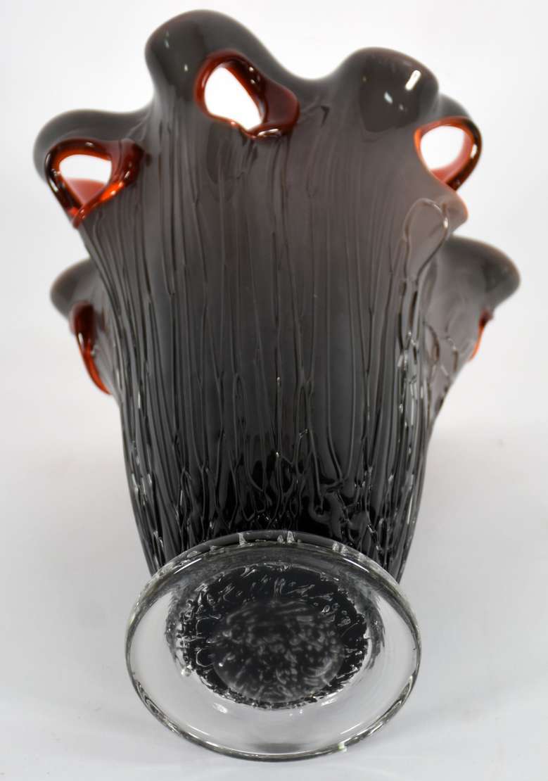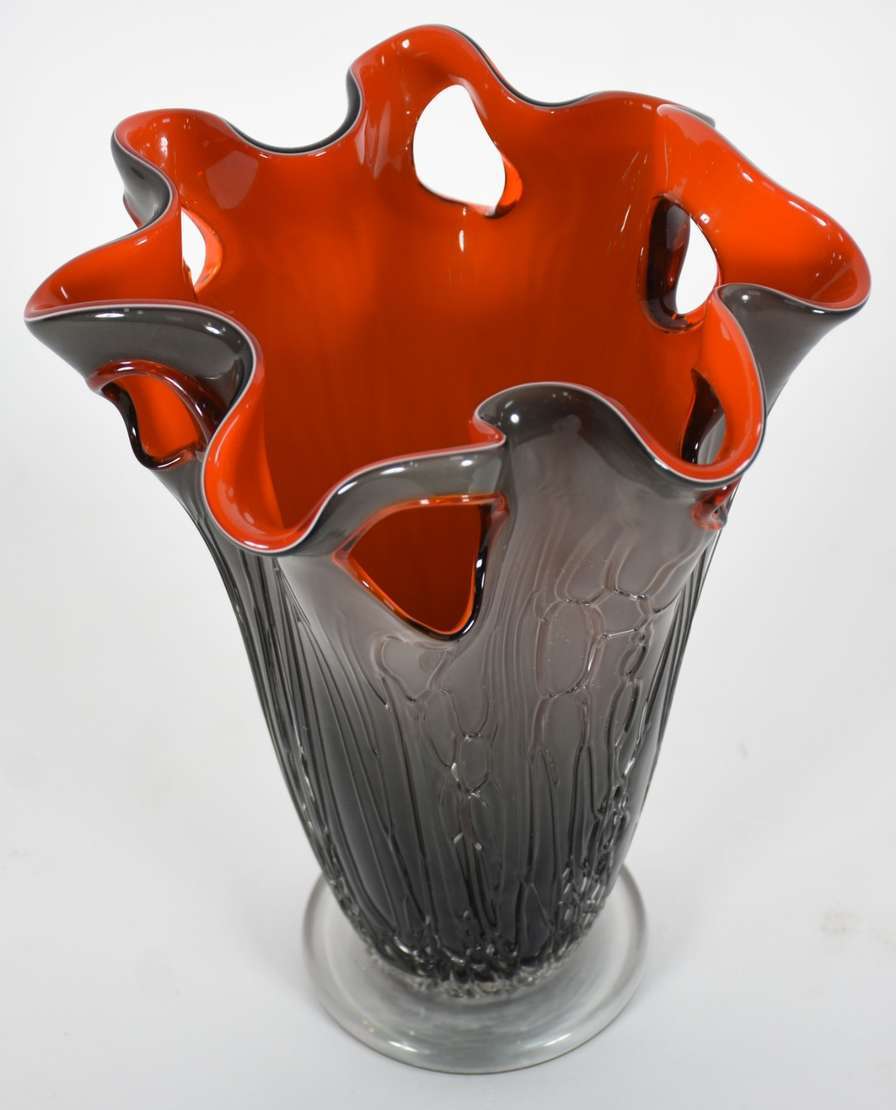 Jarro decorativo de vidro nas cores vermelha degradé e mesclas pretas, borda feitio babado.
