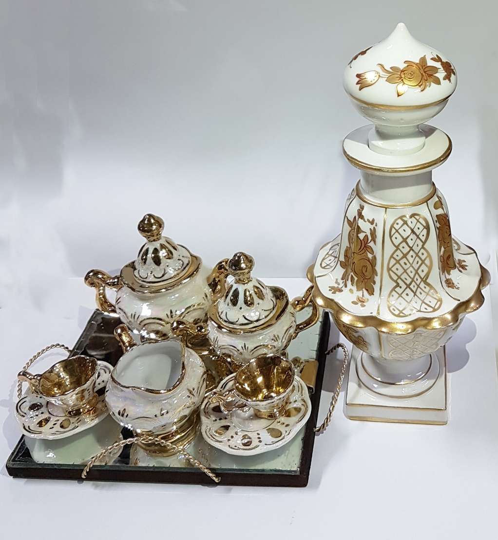 Diversas peças sendo, conjunto para café de porcelana na cor verde com cena romântica composto de: bule, açucareiro, ...