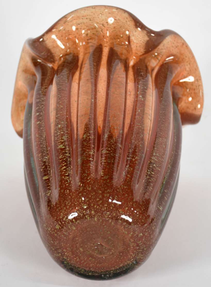 Três peças sendo, vaso de cristal lapidado borda dentada; fruteira de pé alto; e cinzeiro de murano feitio babado.