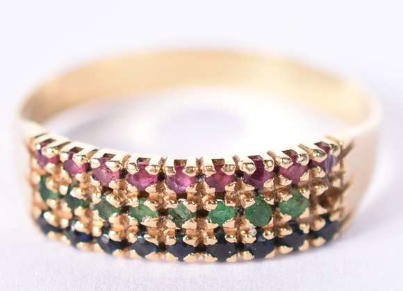 Anel de ouro 18 k com rubis e esmeraldas, aro 15 (Por motivo de segurança a peça não se encontra na loja).