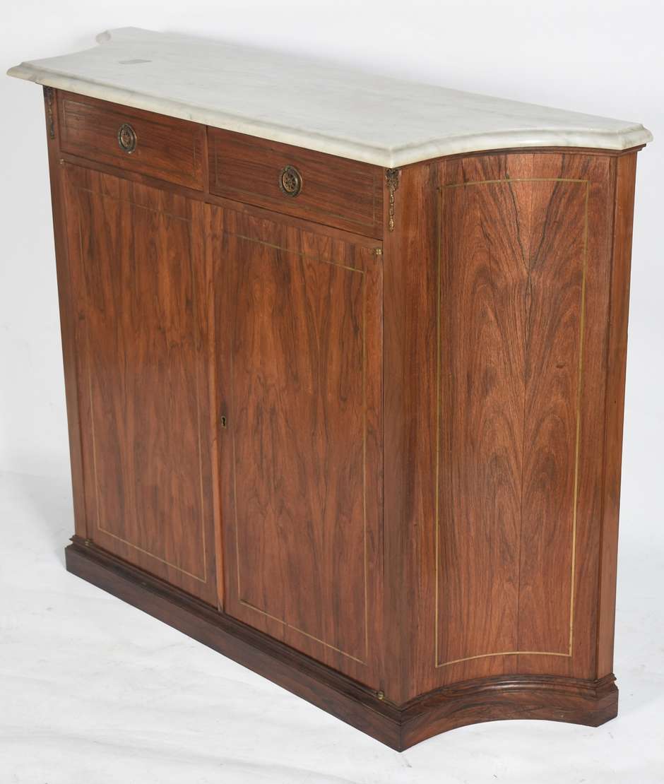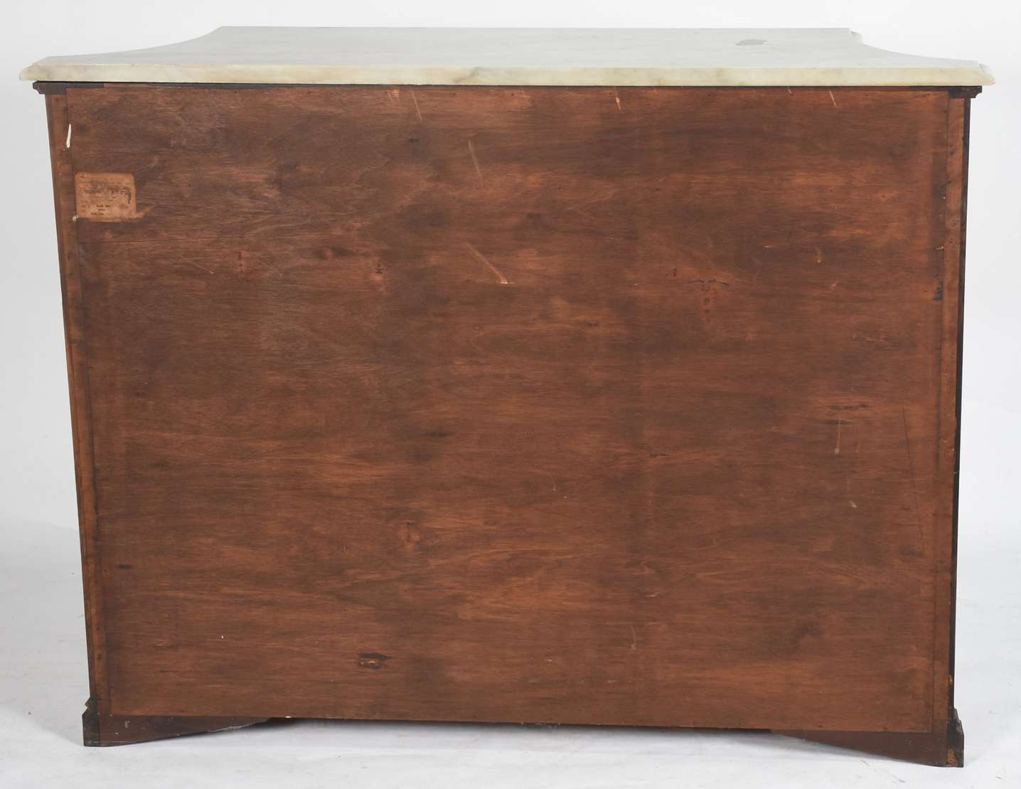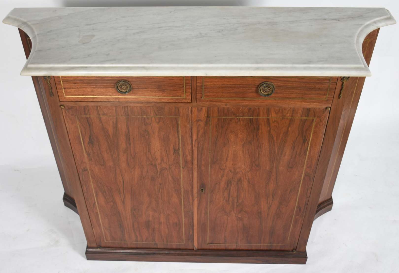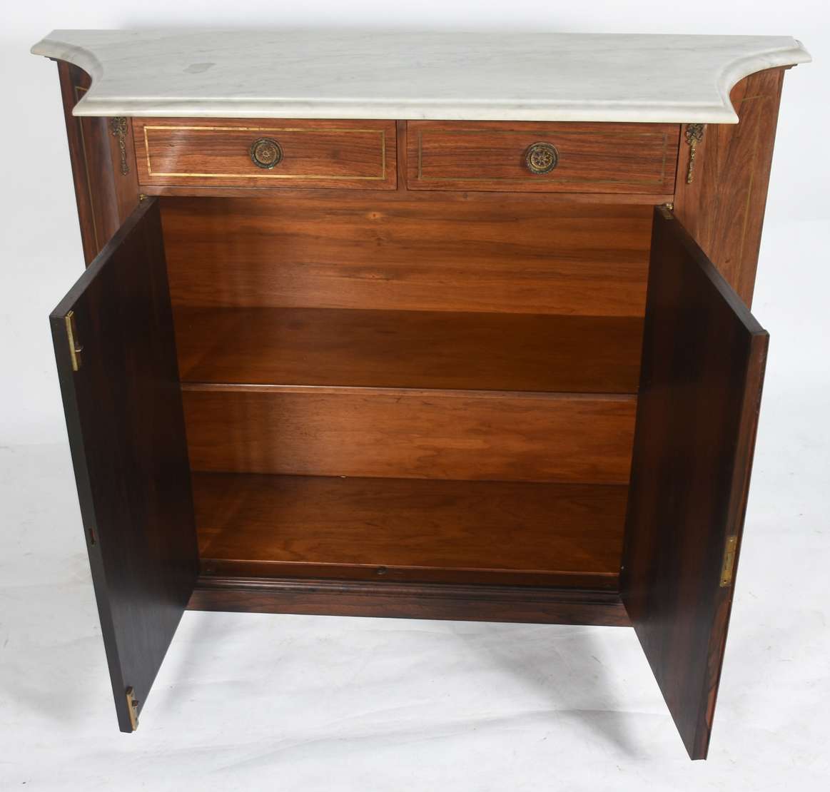 Comoda estilo francês com 2 gavetas, feitio bombe aplicações de bronze, tampo de mármore.