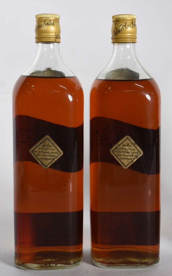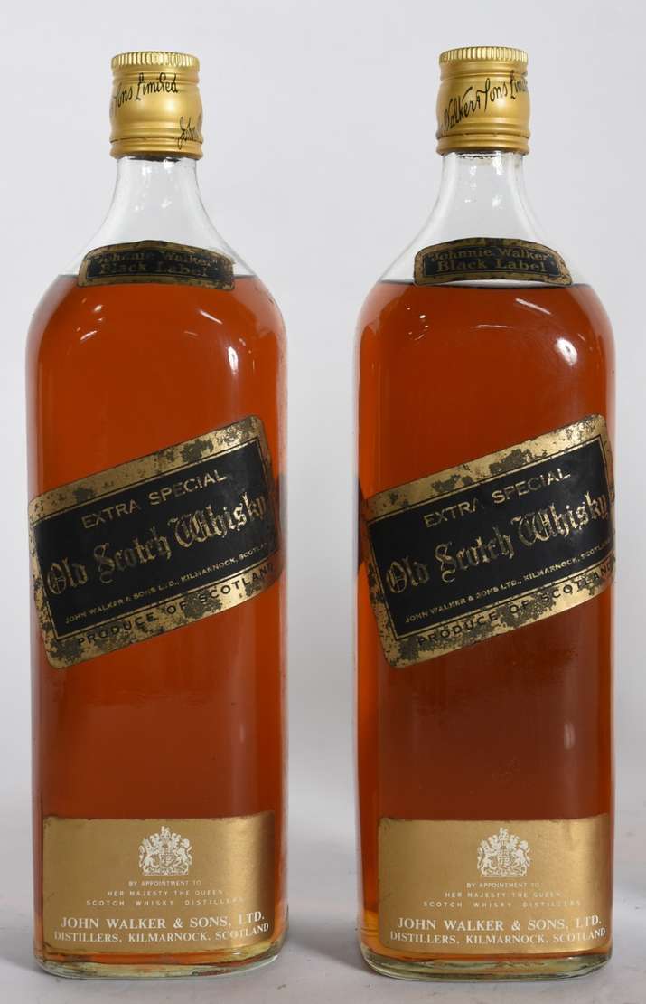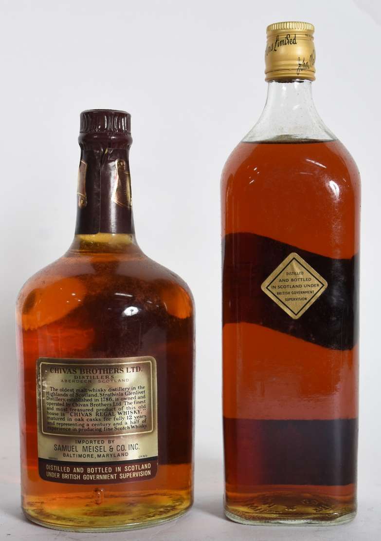 Cinco garrafas de Whisky sendo, 3 Black Label, 1 Chivas Regal e 1 Dimple.