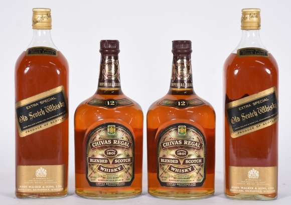 Quatro garrafas de Whisky sendo, 2 Black Label, 2 Chivas Regal.