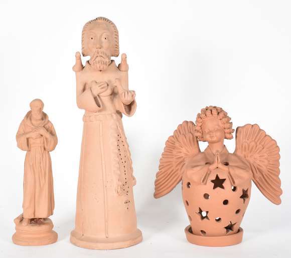 Três peças de barro cozido representando São Francisco (maior) assinado ANTÔNIA, São Francisco (menor) assinado, e a...