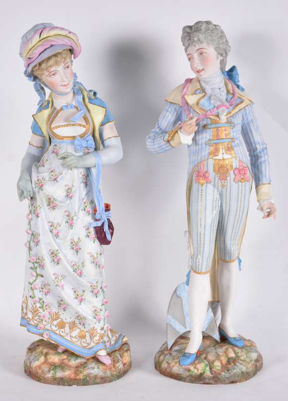 Par de estatuetas de biscuit europeu policromado representando casal de nobres, marcado na base “Depose”. (Rapaz com ...