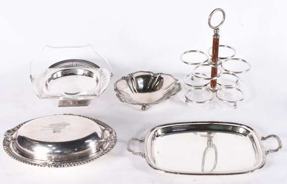 Cinco peças diversas de metal prateado sendo, porta talheres; legumeira com tampa; bandeja, cesta e bowl.