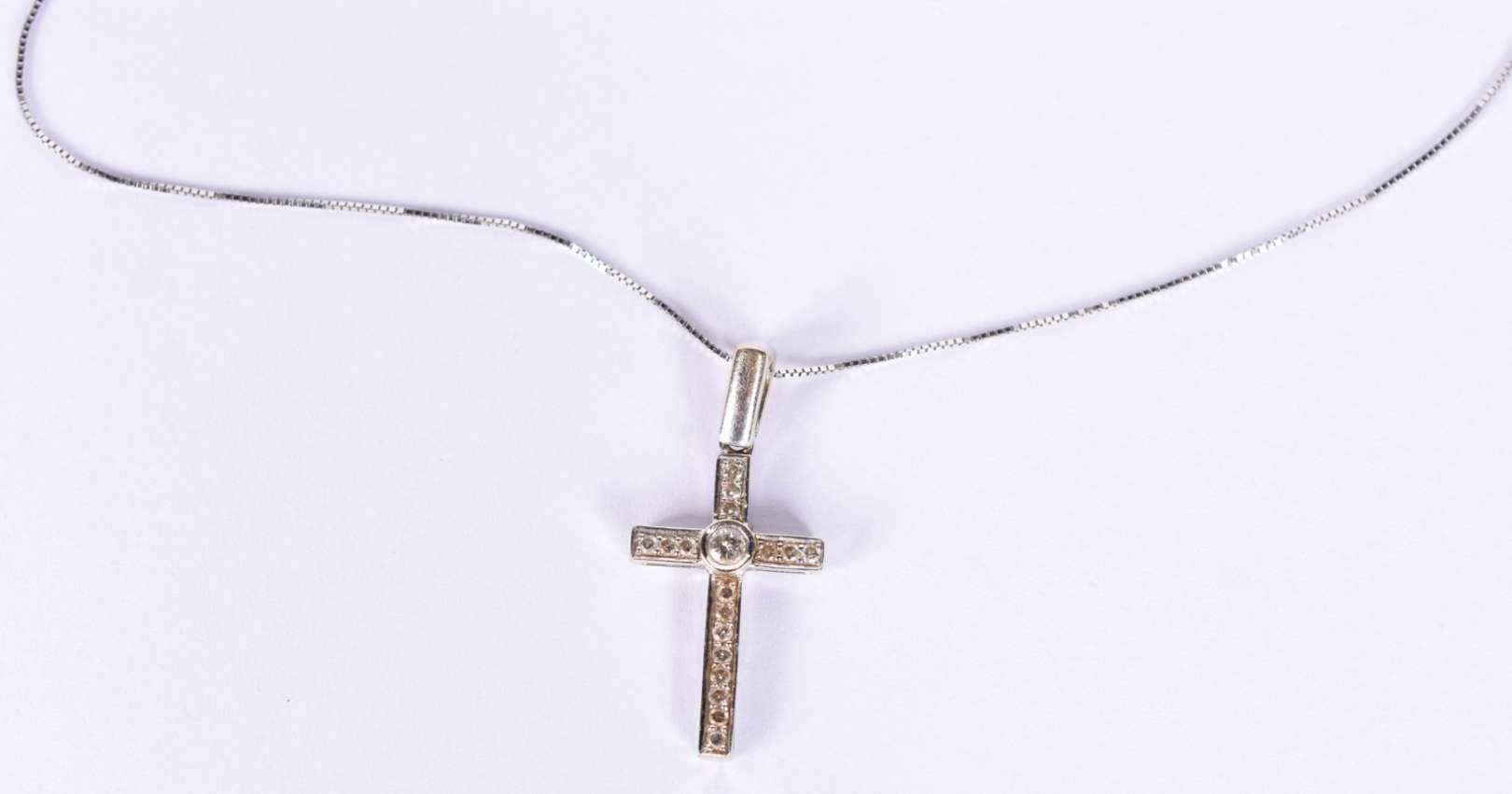 Dois pendentes de ouro, sendo cruz e esmeralda e uma placa com a letra "C" (Por motivo de segurança a peça não se enc...