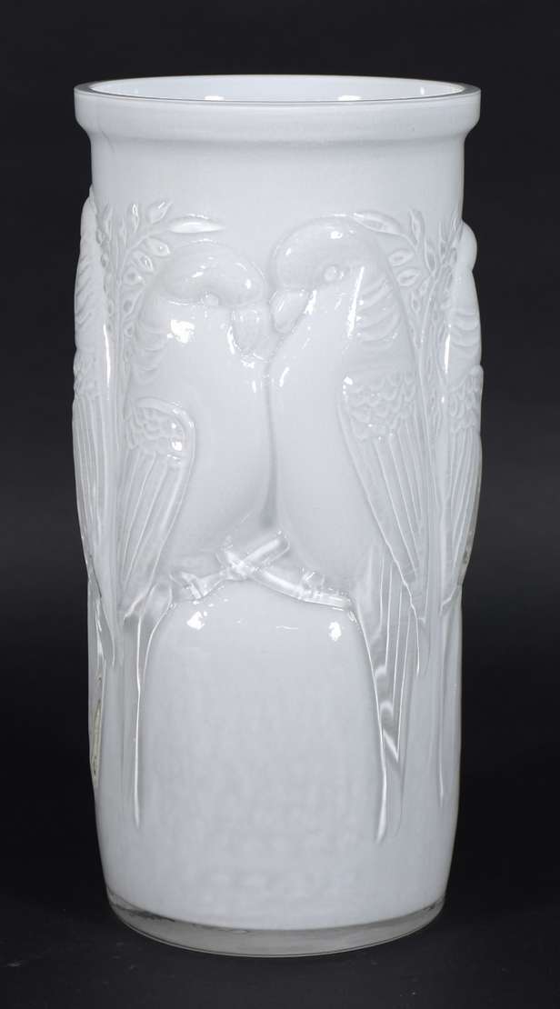 Jarro decorativo de vidro branco leitoso com flores em relevo.
