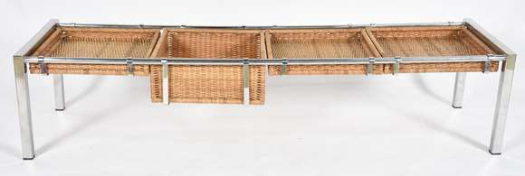 Mesa de de centro com pés e aço cromado e 4 suportes para cestas de rettan.