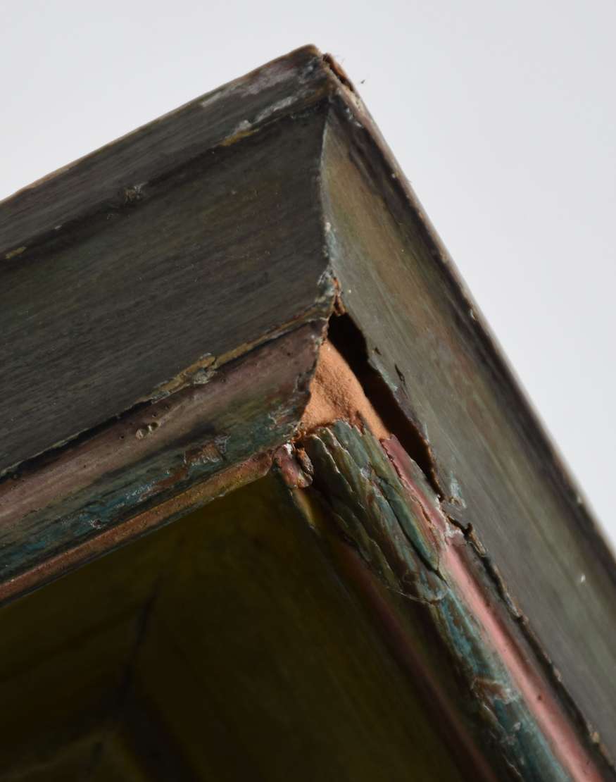 Fusin com tempera com moldura entalhada em folhas de lírios e brasão imperial.