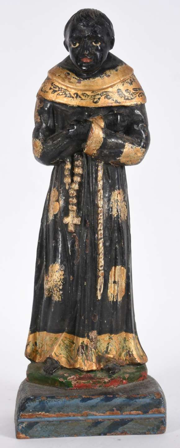 Antiga imagem de madeira policromada representando São Benedito.