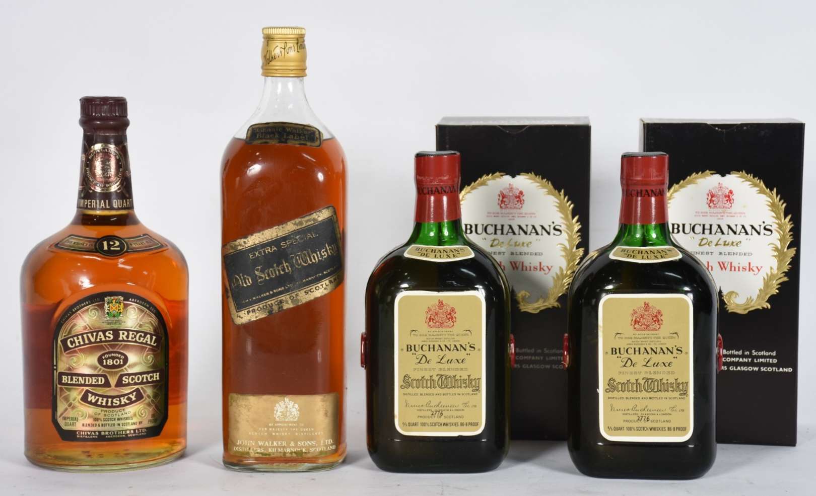 Quatro garrafas de Whisky sendo, 1 Black Label, 1 Chivas, 1 Cutty Sark, 1 Buchanan's.