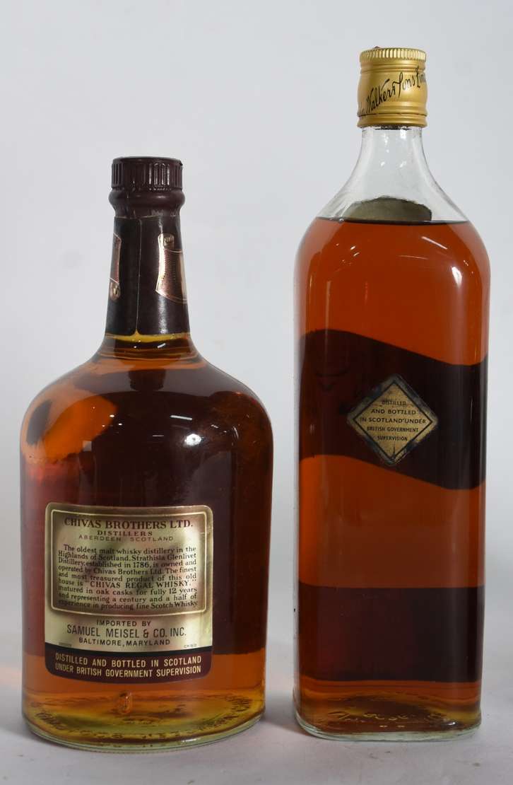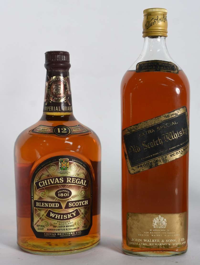 Cinco garrafas de Whisky sendo, 3 Black Label, 1 Chivas Regal e 1 Dimple.