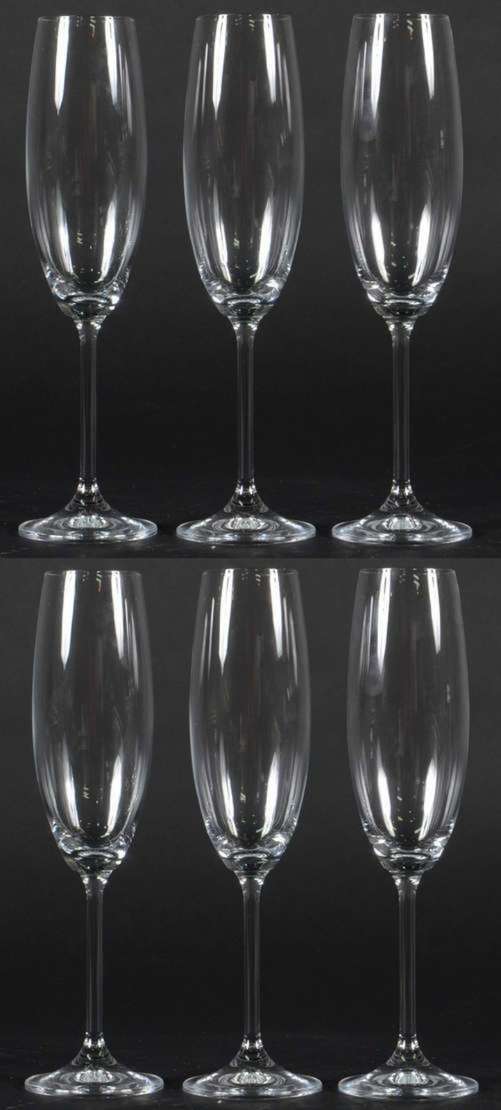 Seis copos de vidro de pé alto com detalhes foscos.