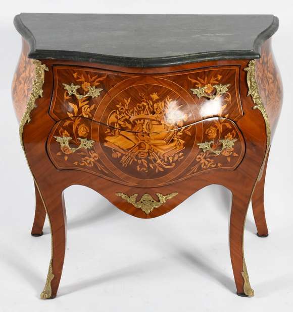 Comoda estilo francês com 2 gavetas, feitio bombe aplicações de bronze, tampo de mármore.