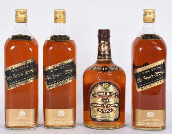 Quatro garrafas de Whisky sendo, 3 Black Label, 1 Chivas Regal.