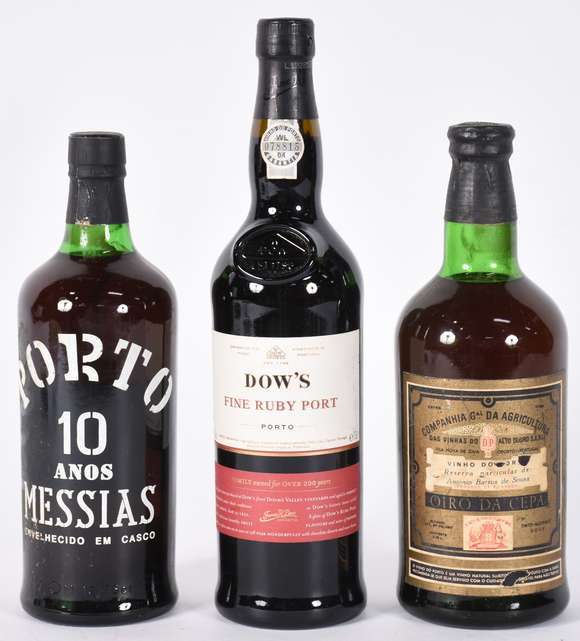 Três garrafas de vinho do Porto, sendo Porto 10 anos Messias, Dow's e Oiro da Cepa Reserva particular de Antonio Barr...