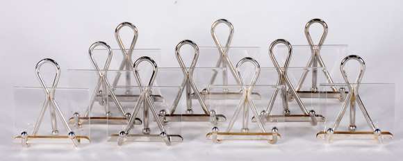 Dez marcadores de lugar de metal prateado e placa dupla de acrílico para colocar o nome dentro.