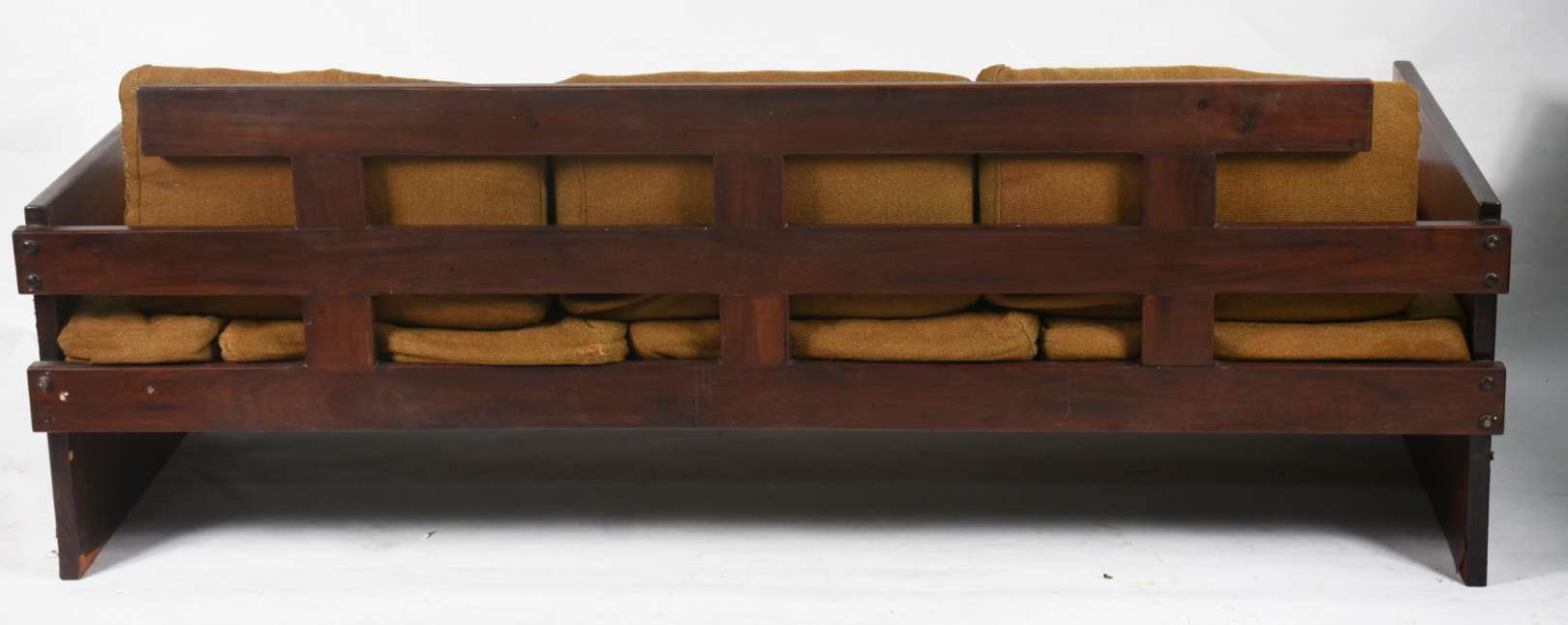 Poltrona Parati com base de madeira nobre, estofamento forrado de tecido bege (com desgastes). Anos 60.