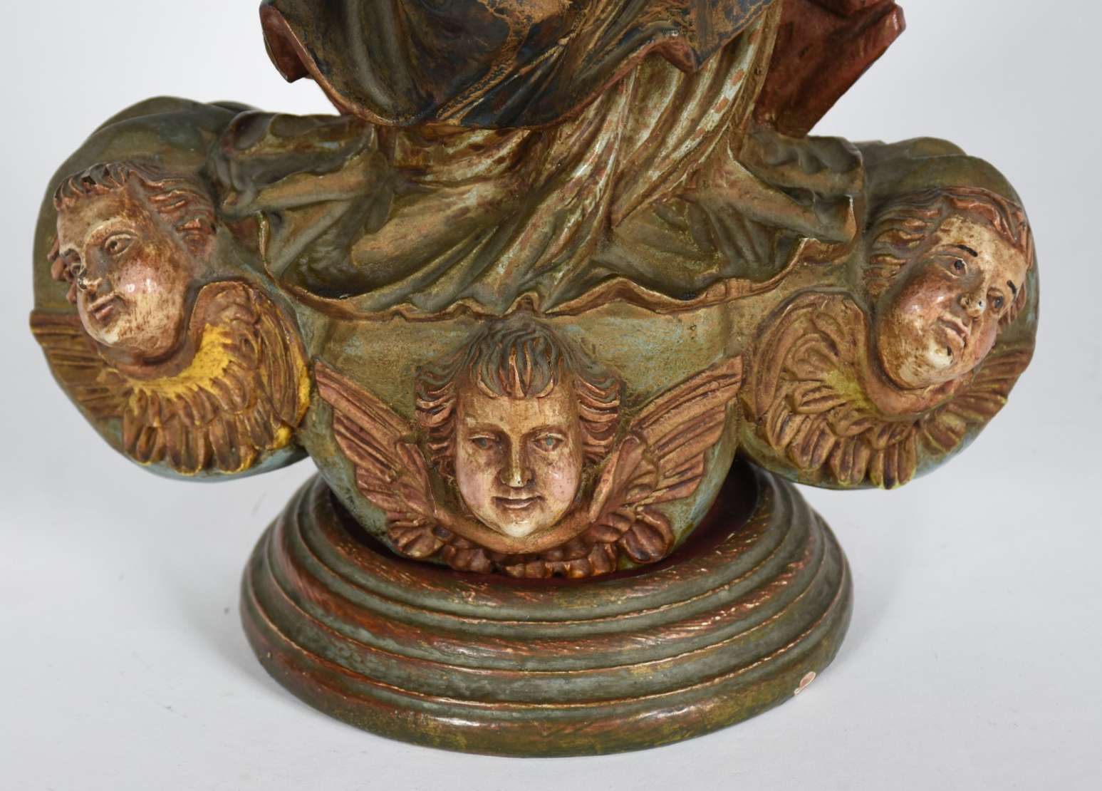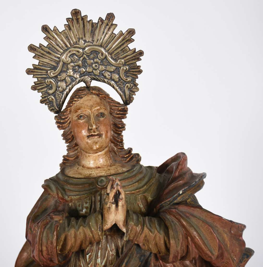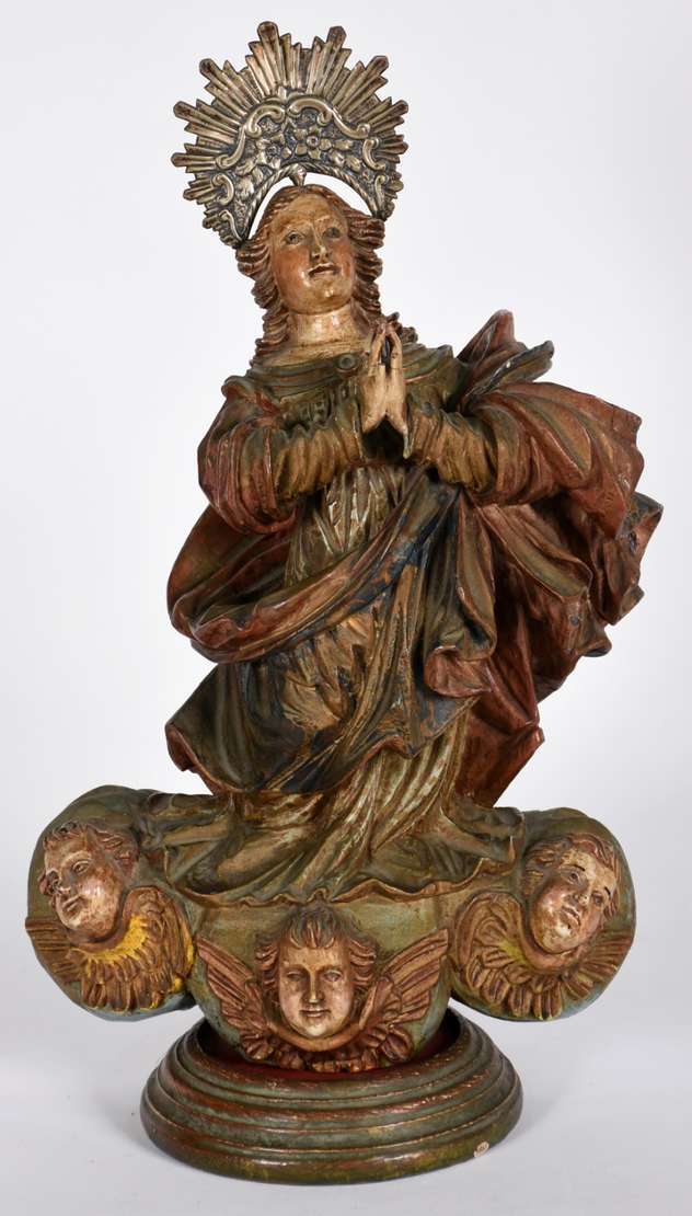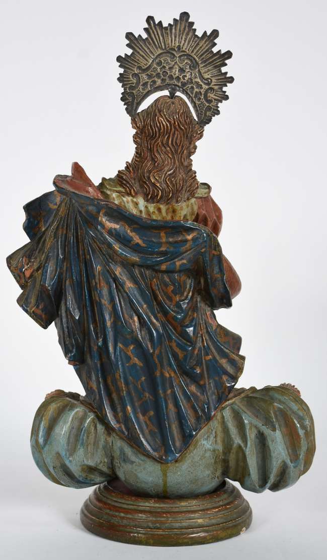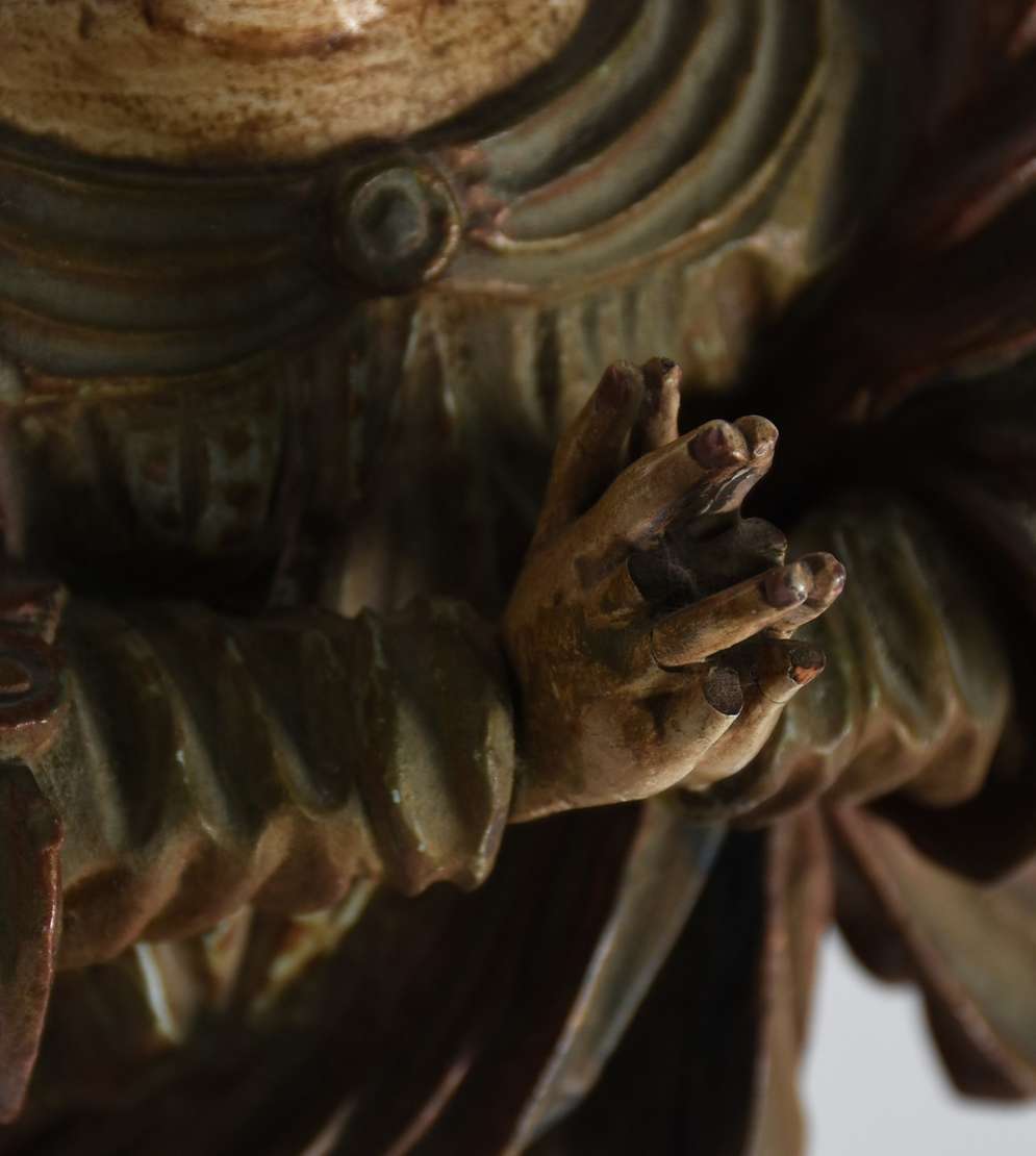 Escultura de madeira com entalhes e pintura policromada. Assinada.