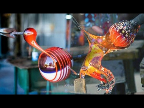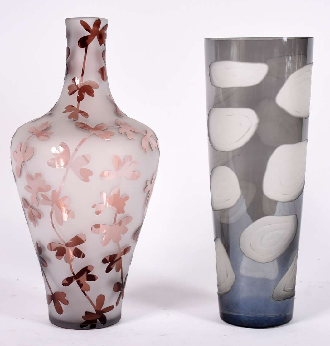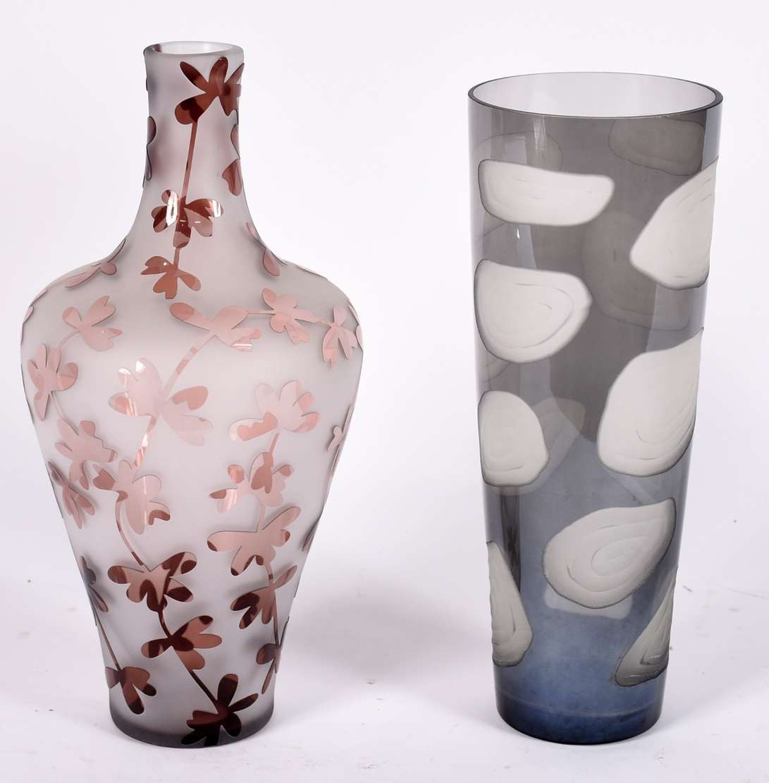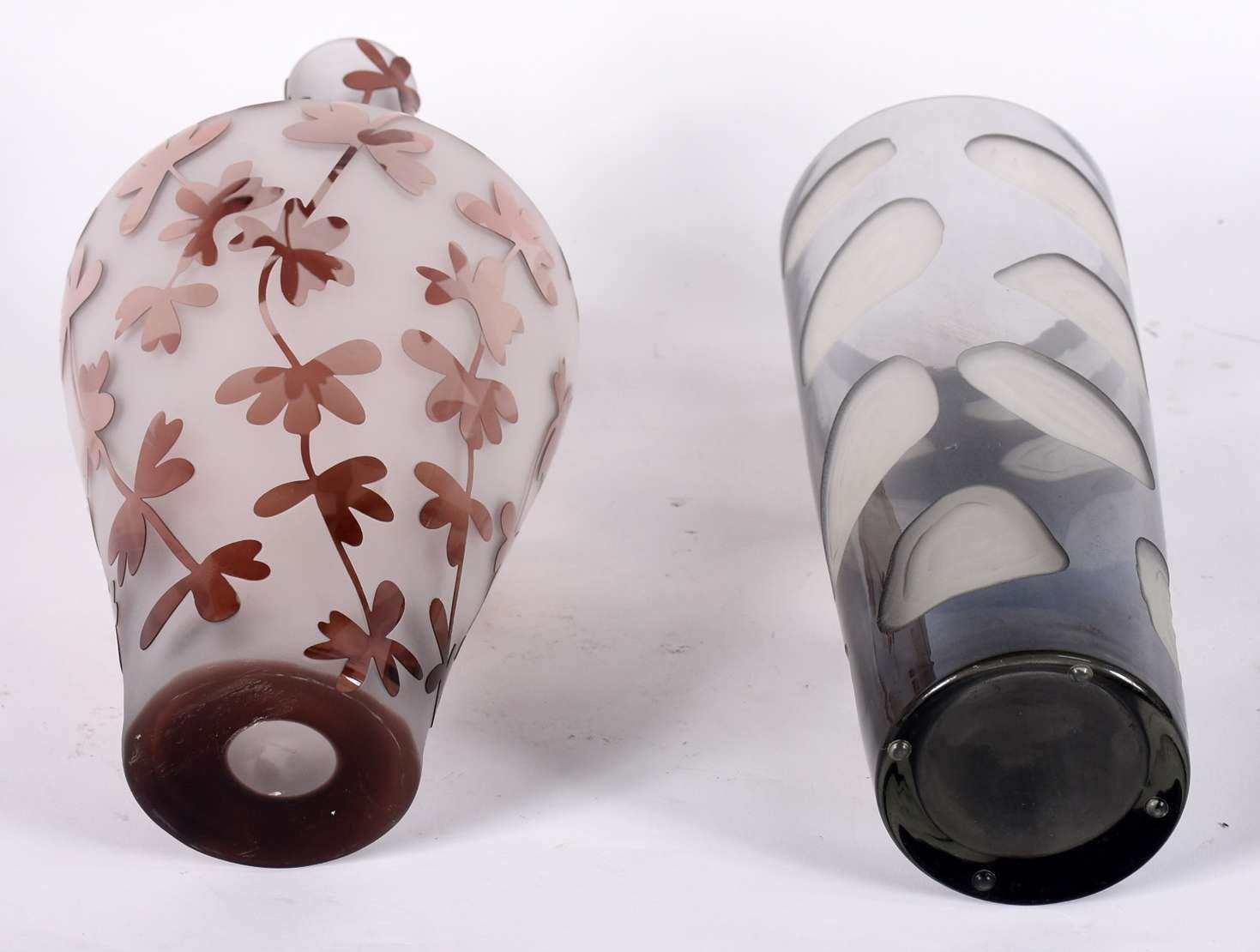 Seis vasos decorativos de vidro em tons de verde, diferentes formatos e procedências.