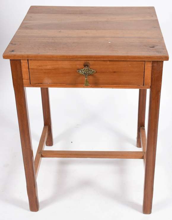 Mesa auxiliar feitio quadrado de madeira nobre, uma gaveta, pernas retas ligadas por traves inferiores.