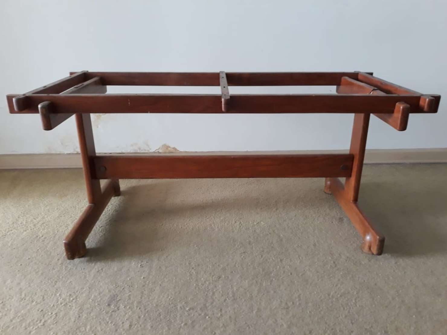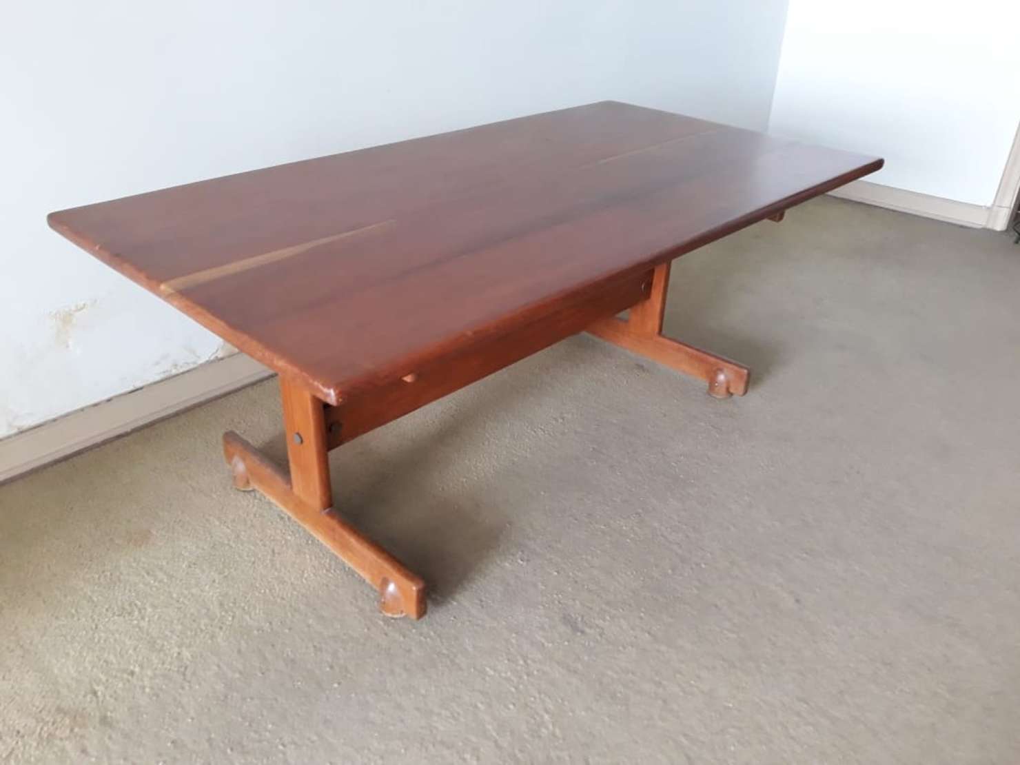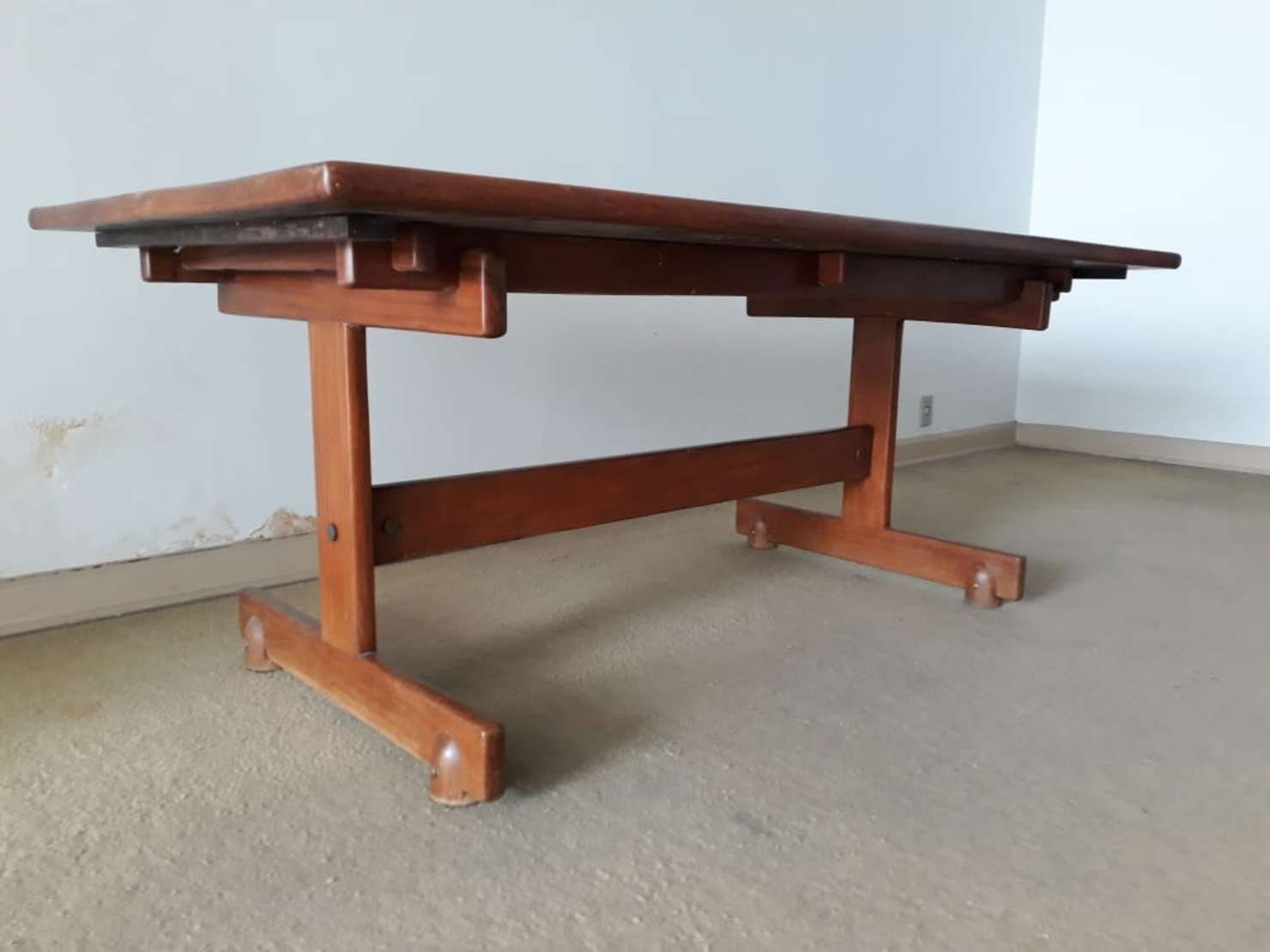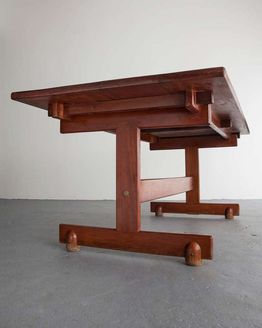 Coluna de madeira nobre, tampo retangular com quatro colunas torneadas unidas por platô inferior.
