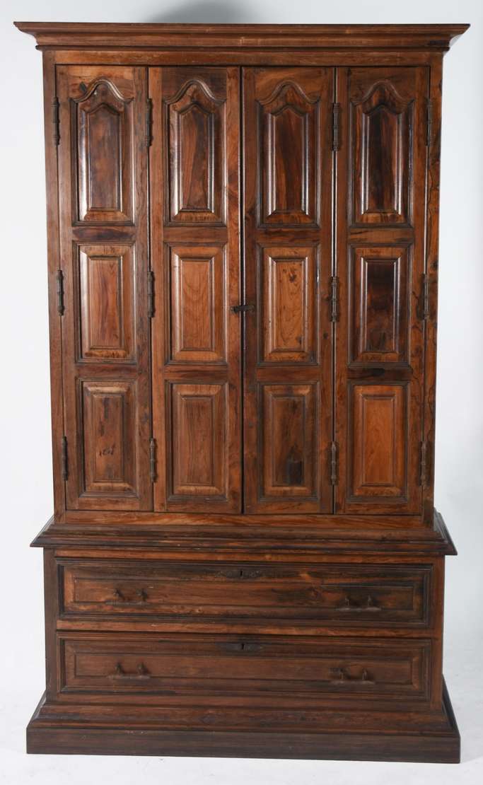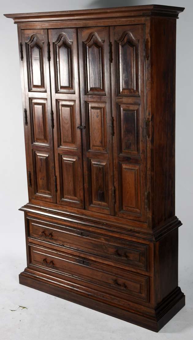 Coluna de madeira nobre, tampo retangular com quatro colunas torneadas unidas por platô inferior.