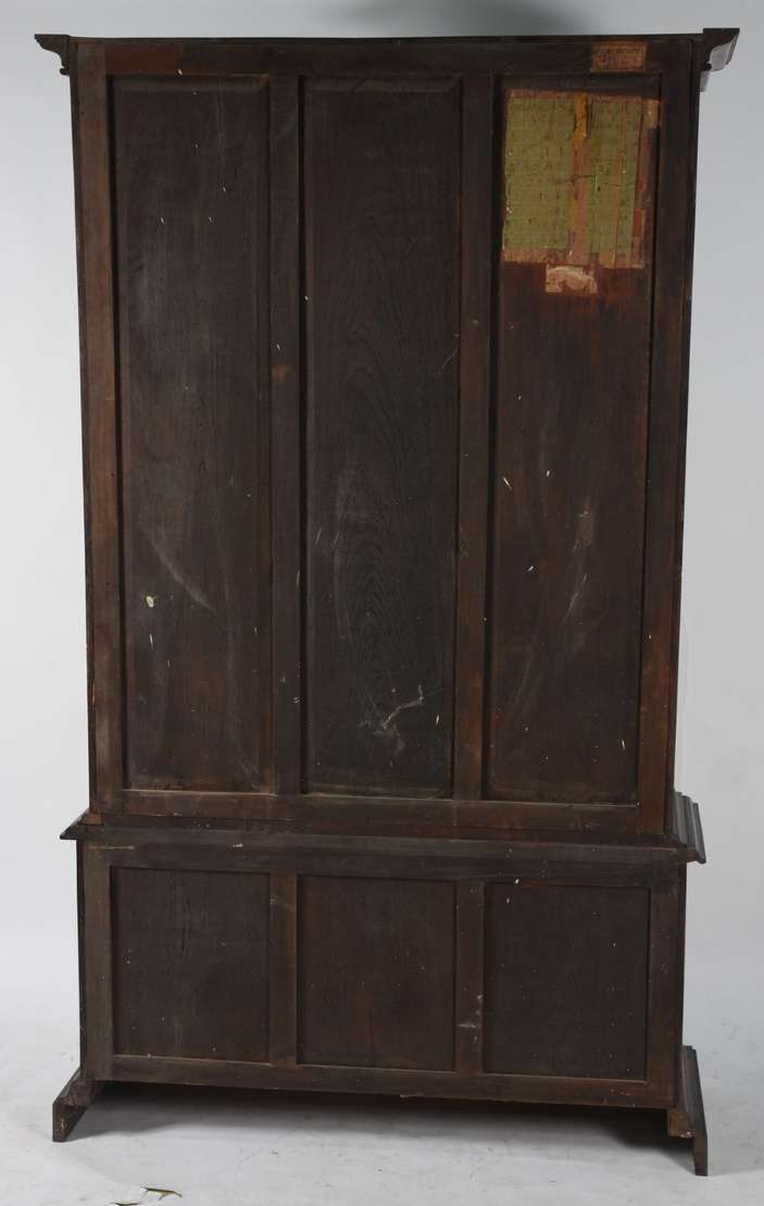 Mesa console de madeira nobre, tampo dobrável, saia canelada, apoio em quatro colunas torneadas ligadas por platô in...