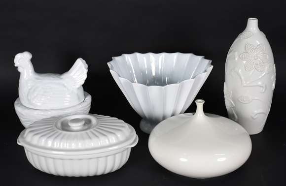 Cinco peças diversas de cerâmica branca, sendo vaso em gomos; vaso alto com flores em relevo; vaso baixo bojudo; terr...