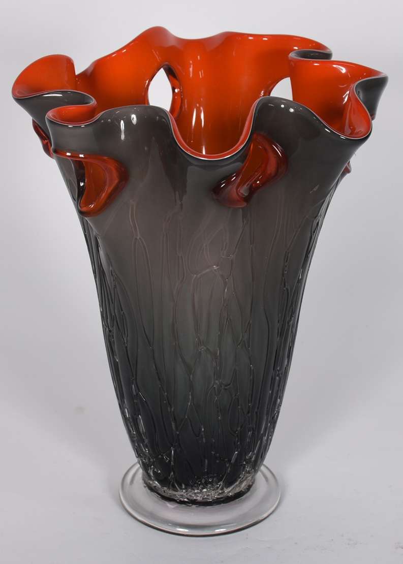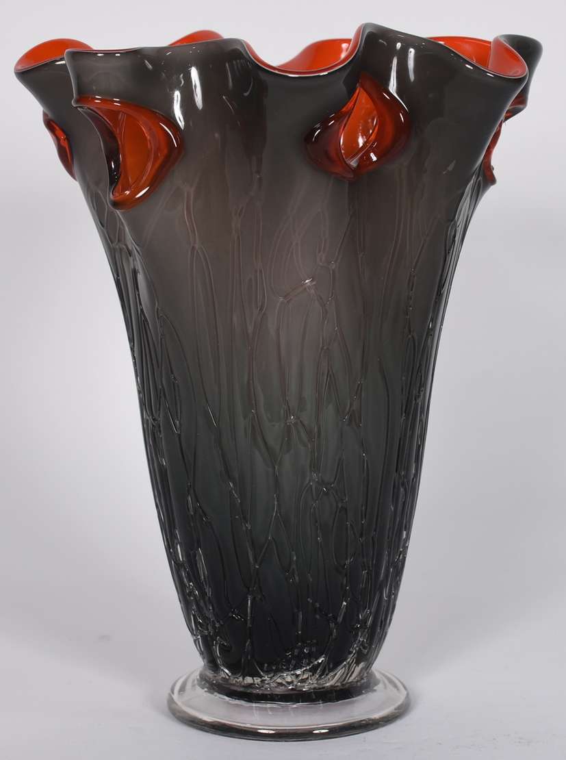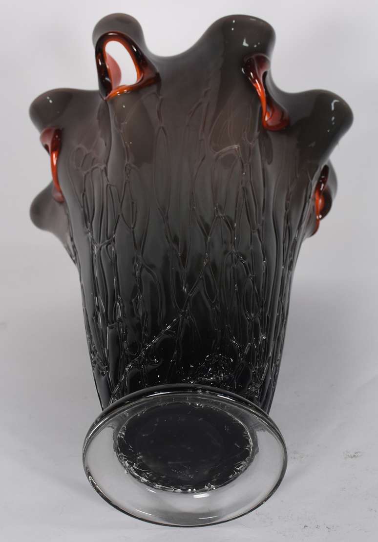 Vaso de opalina verde com aplicação floral de metal e bocal com vazados.