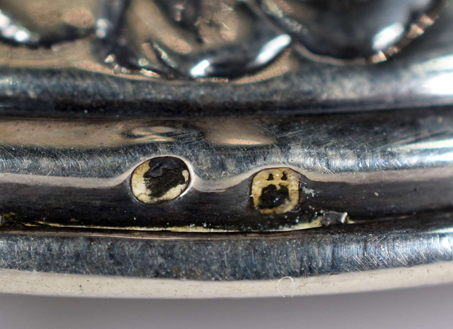 Baixela para chá e café de metal prateado composto de 4 peças. Acompanha bandeja e açucareiro de outra marca. Total 6...