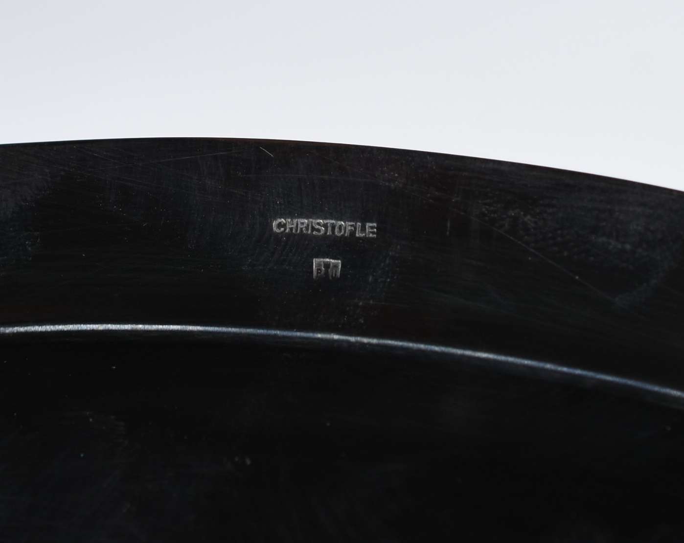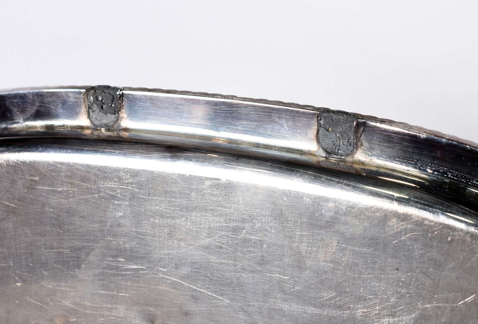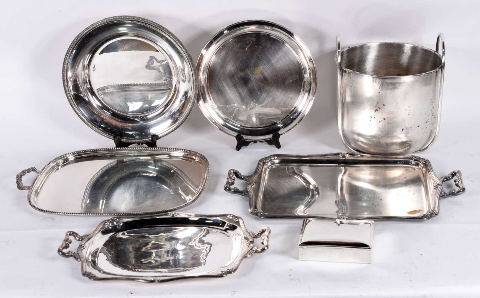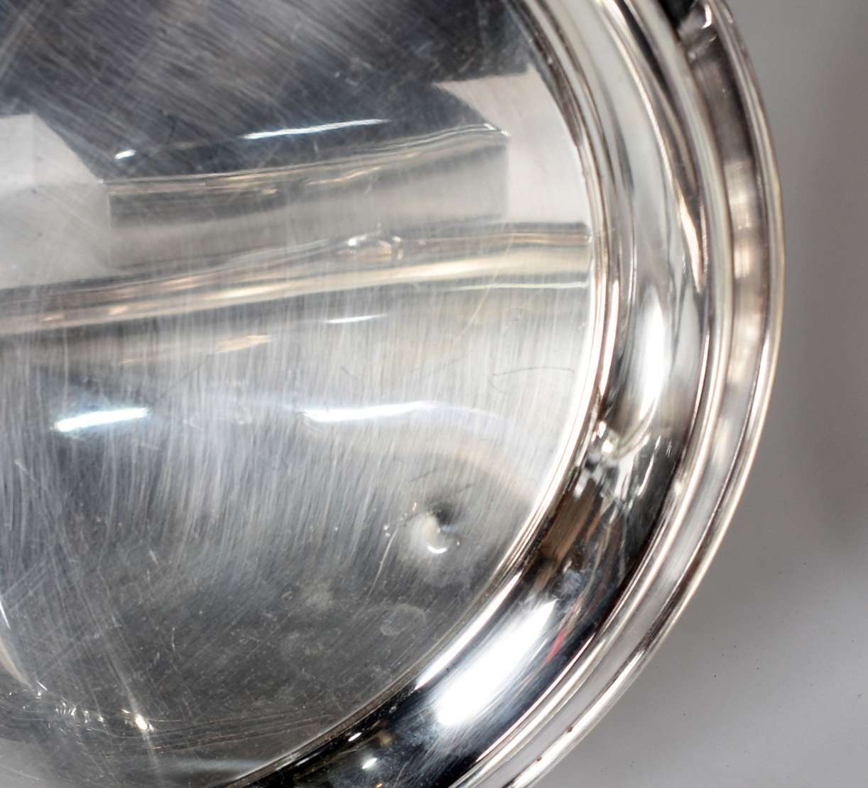 Três peças de metal prateado sendo sopeira, salva e candelabro.