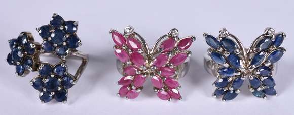 Conjunto de 3 anéis de prata de lei contrastados sendo anel com borboleta com 18 rubis navetes aro 19, anel com borb...