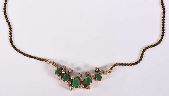 Colar de ouro 18 k contraste 750 com pendente fixo com 18 diamantes de 2 a 3 pontos variados e 5 esmeraldas (Por moti...