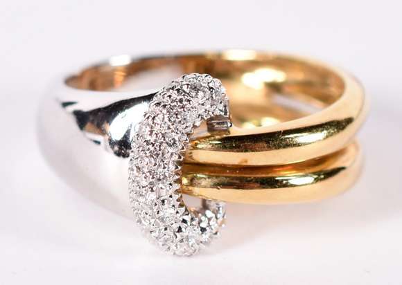 Anel aro duplo em ouro 18 k e ouro branco, cravejado com diamantes, contrastado, designer Italiano, aro 18 (Por motiv...