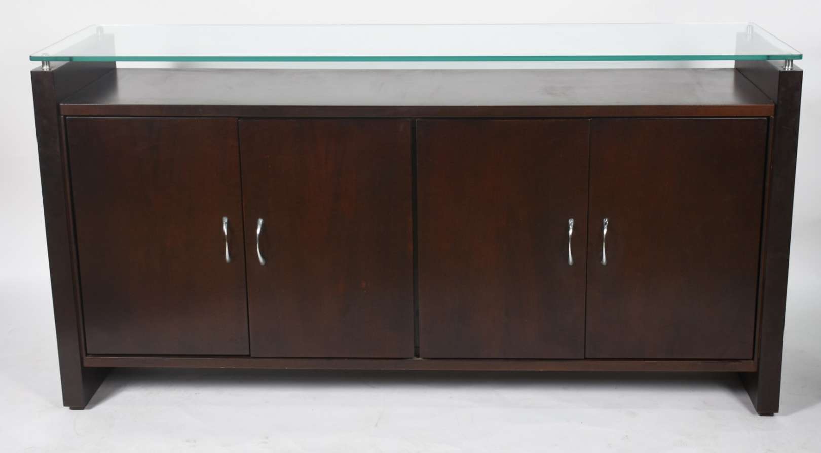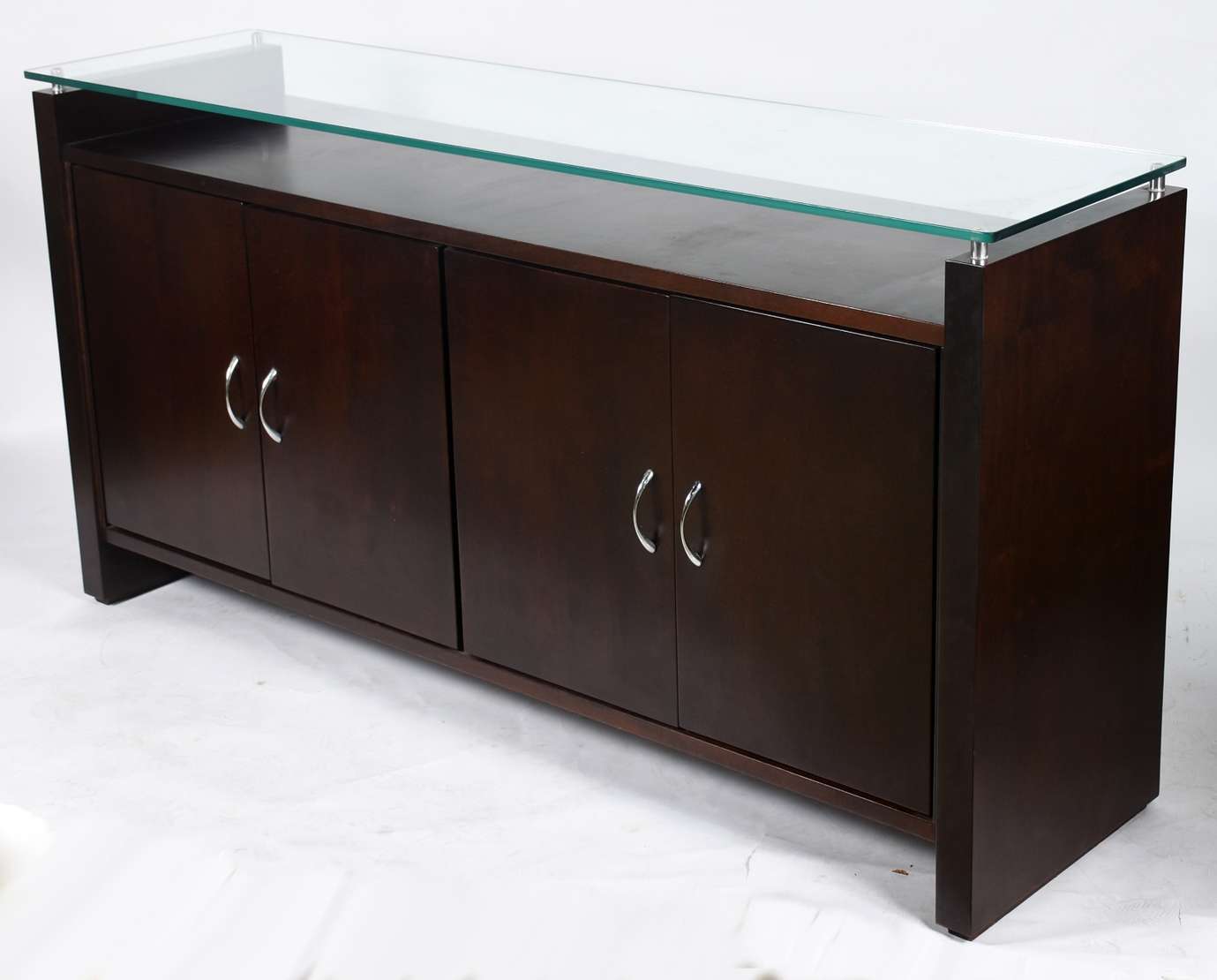 Buffet com quatro portas, prateleiras internas e tampo de vidro.