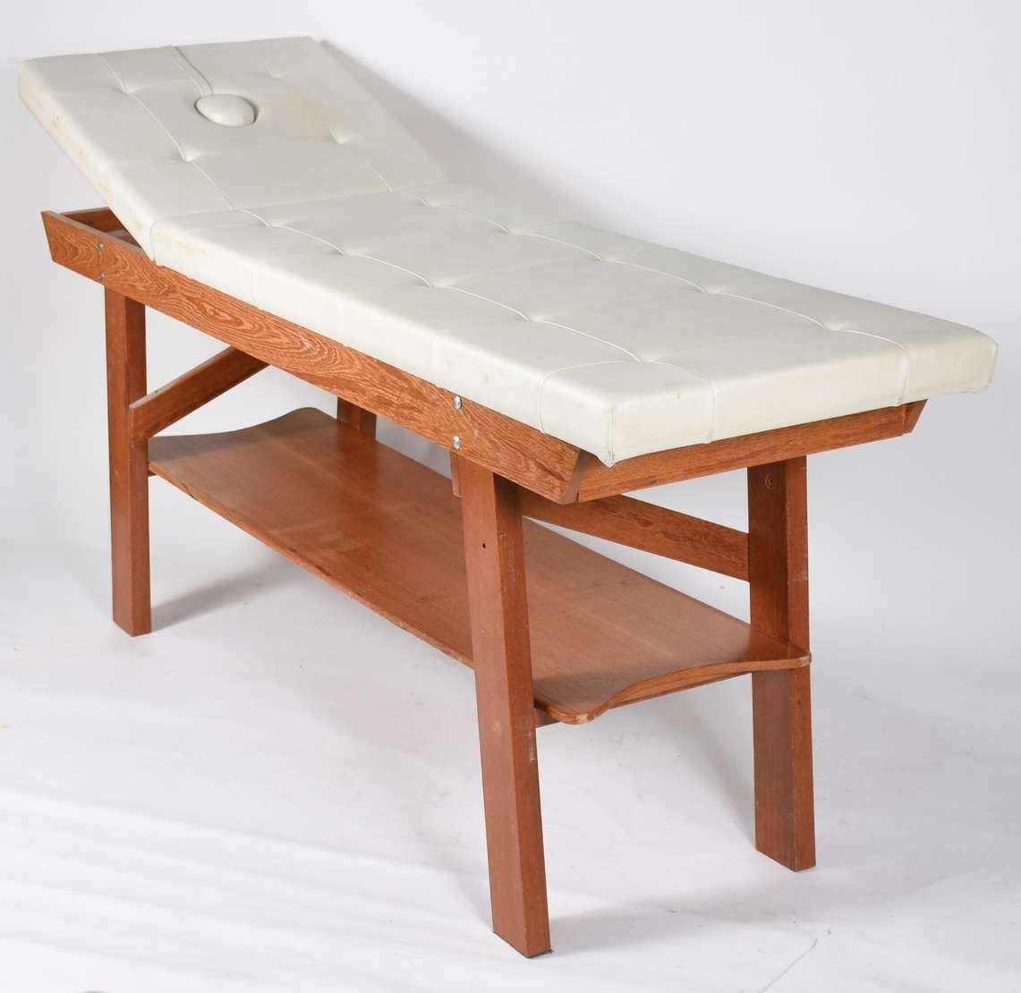 Sofá para 3 lugares estofado e forrado com tecido bege (tecido com desgastes).