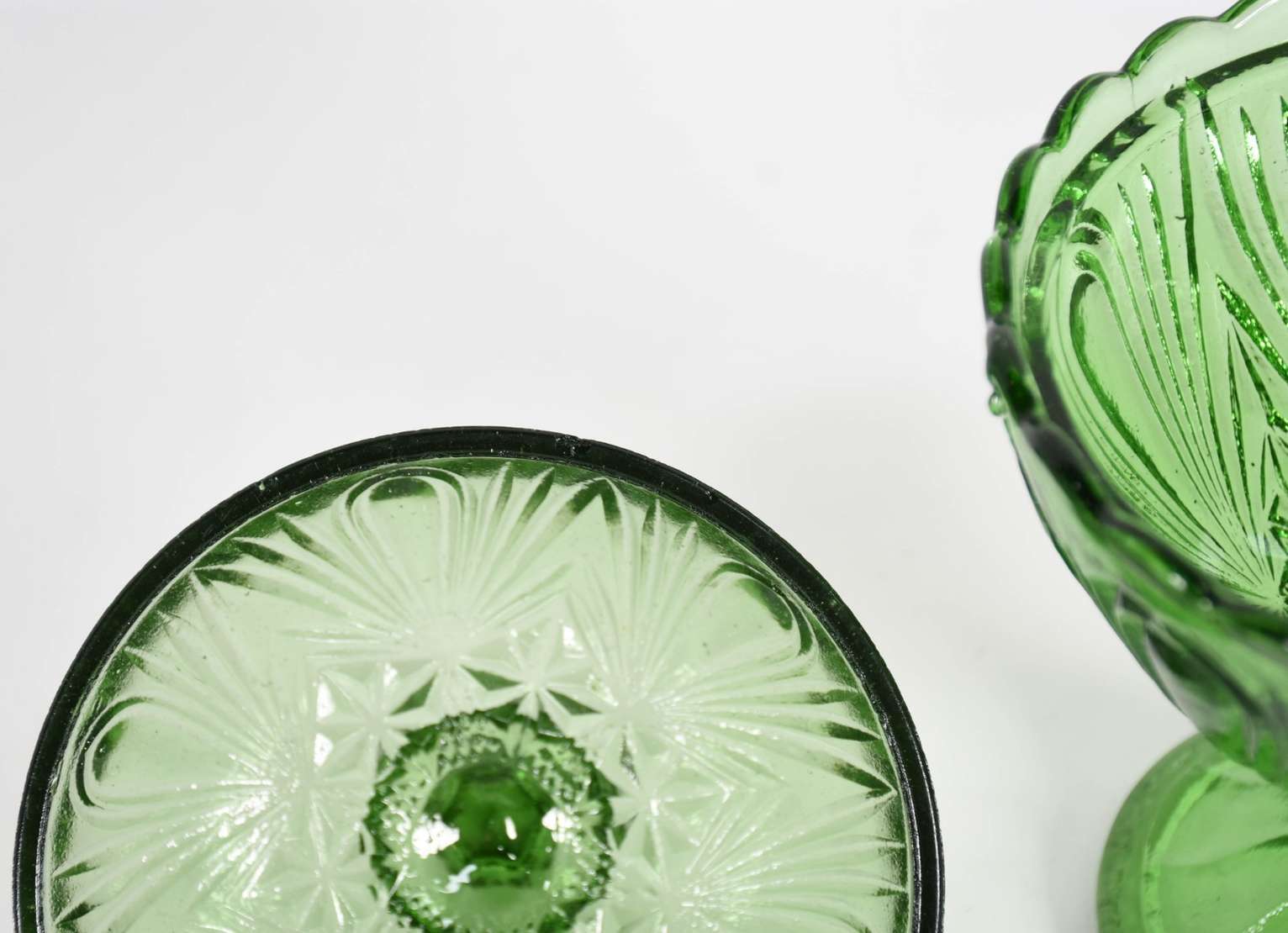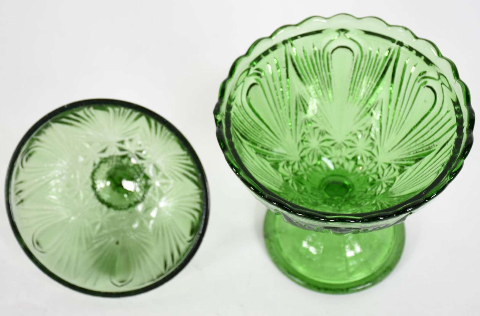 Duas fruteiras de cristal, sendo uma redonda pequena com pé de metal.