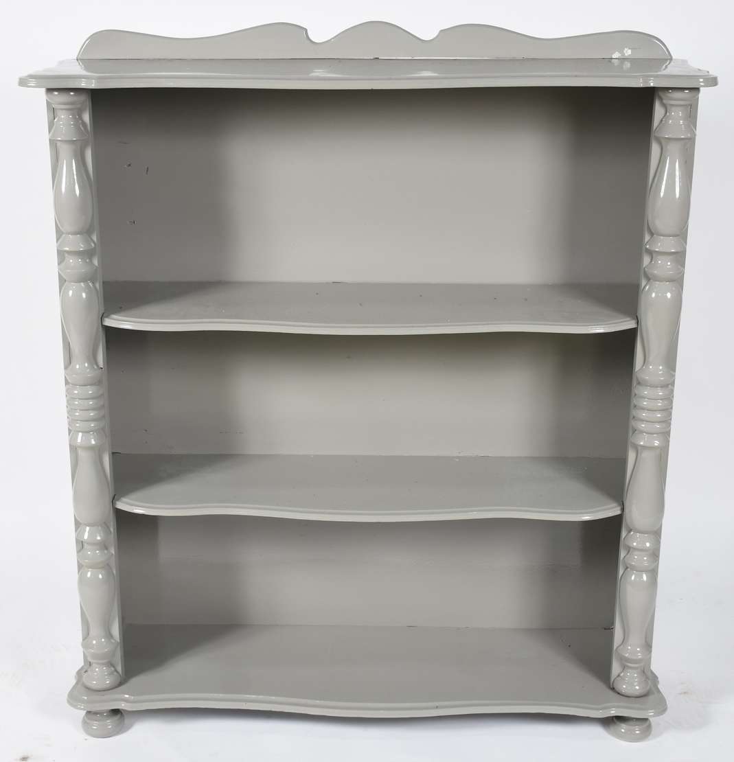 Coluna de madeira nobre, tampo retangular com quatro colunas torneadas unidas por platô inferior.