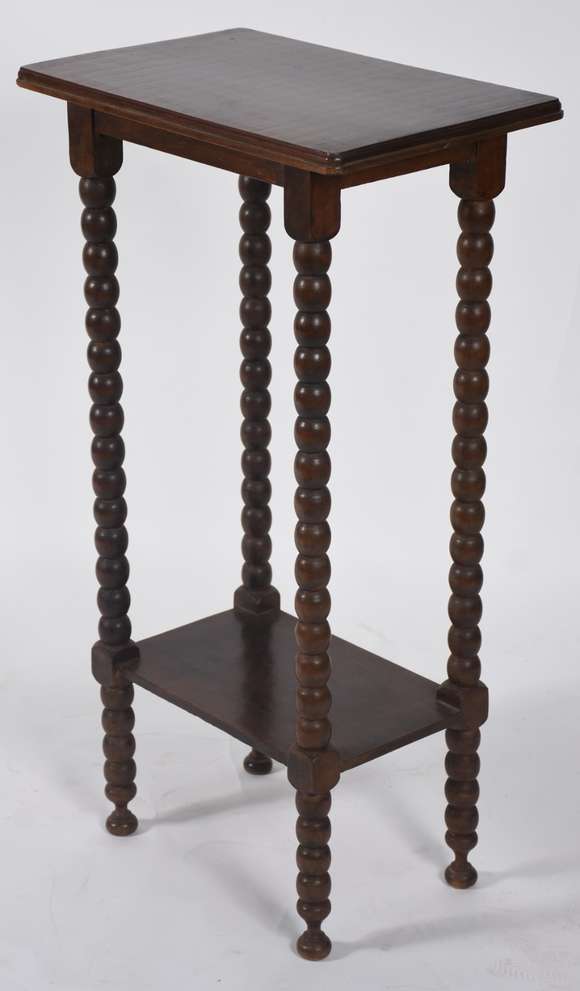 Coluna de madeira nobre, tampo retangular com quatro colunas torneadas unidas por platô inferior.