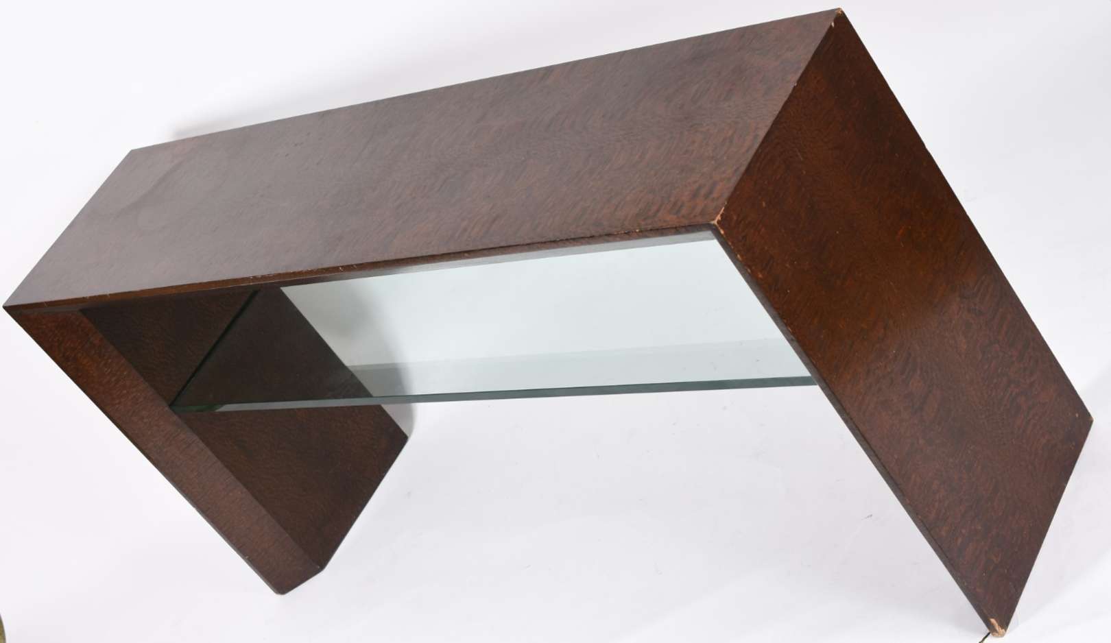 Mesa com base de metal, pernas ligeiramente arqueadas, tampo de vidro.