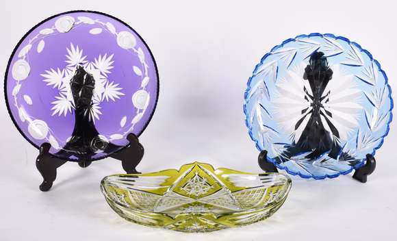 Três pratos para sobremesa de cristal doublé lapidado, nas cores lilás, verde e azul.