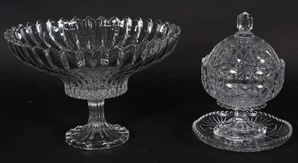 Duas peças de cristal sendo compoteira com presentoir e fruteira.