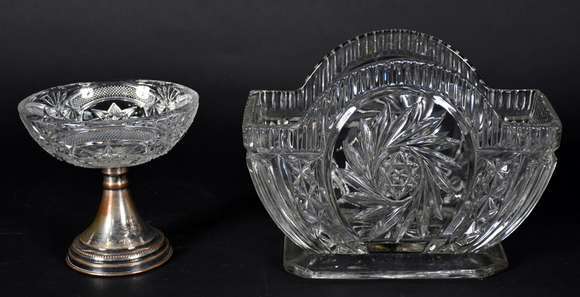Duas fruteiras de cristal, sendo uma redonda pequena com pé de metal.